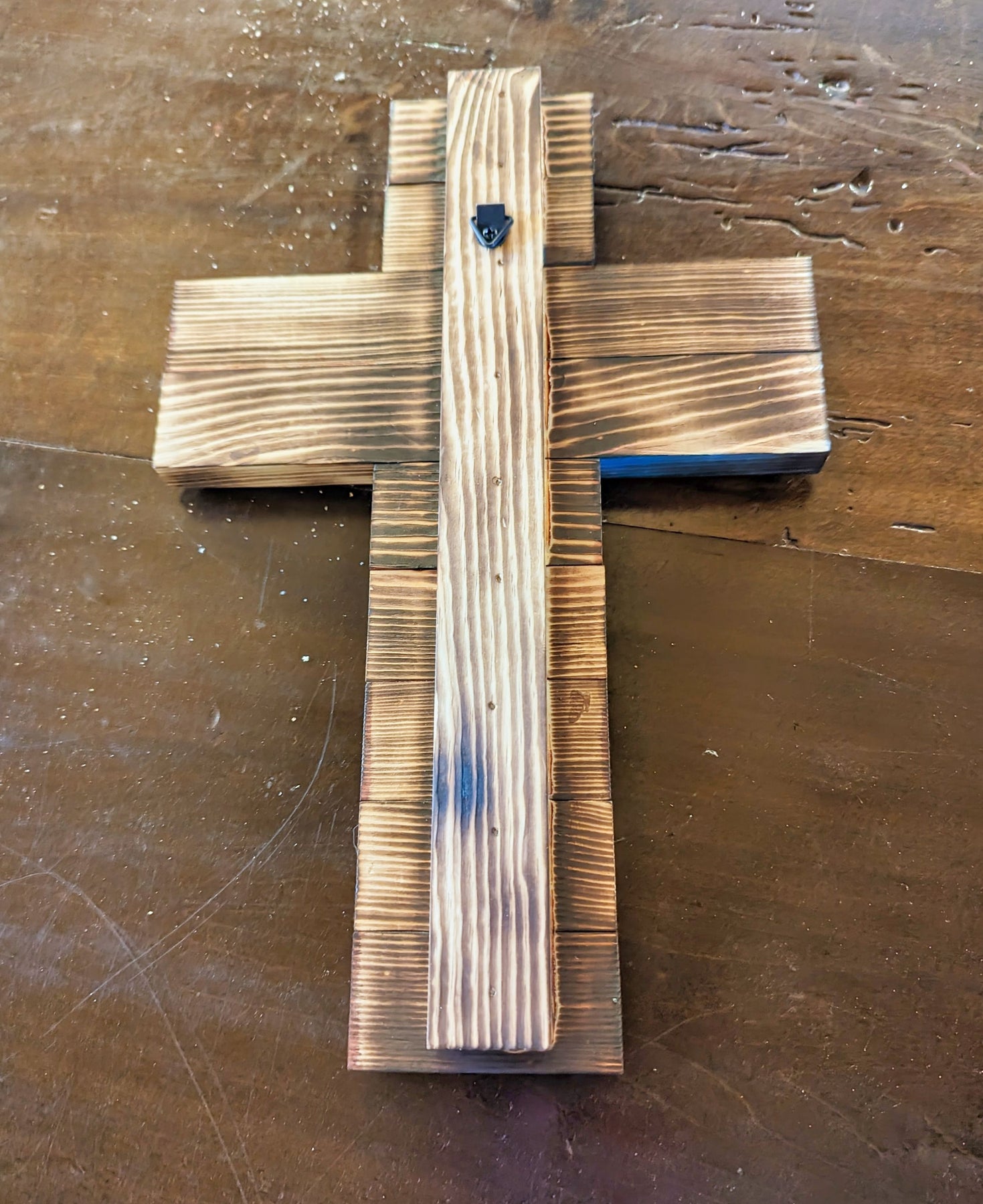 The Cross comes with a small triangle ring hanger already attached which makes it easy to hang on the wall.