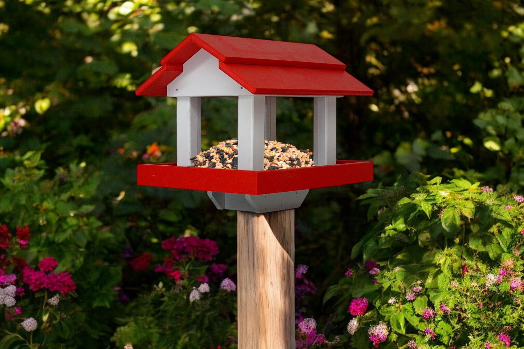 Enjoy Free Shipping to the continental USA when you order from Harvest Array. Add a touch of rustic charm to your garden with a bird feeder that is as beautiful as it is practical. Order your Amish-made Poly Post Mounted Bird Feeder today and create a welcoming environment for birds in your backyard!