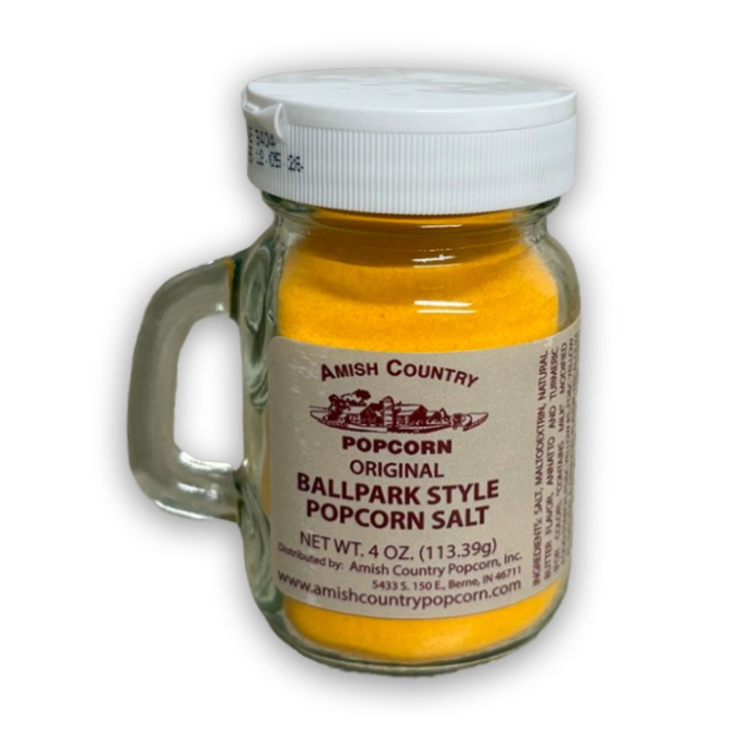 Feel like you are at the game with our Amish Country Ballpark Style Popcorn Salt in a fun 4 oz Jar at Harvest Array.