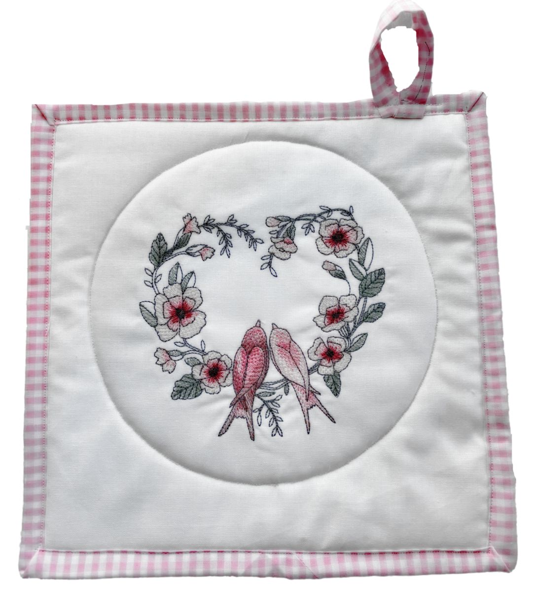 Handmade Embroidered Lovebirds in Bloom (rose) Potholder/Hot Pad is 9.5 inches square.