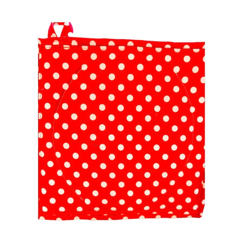 The back of the Chicken Sunshine Potholder is orange with white polka dots. This pattern carries over to the front side as the border.