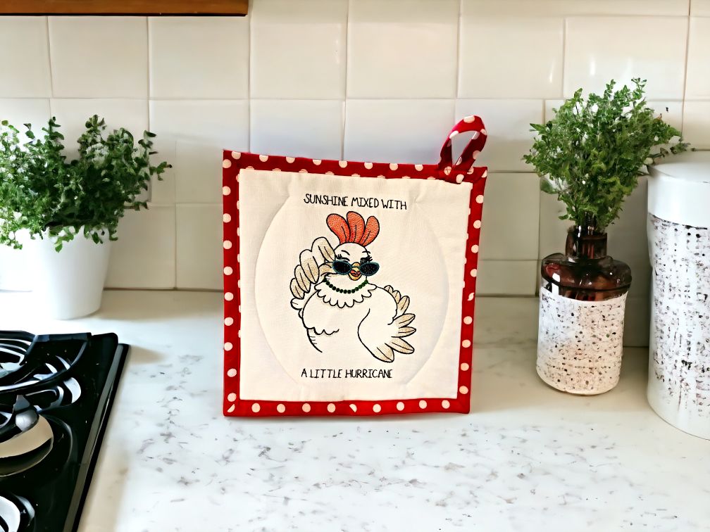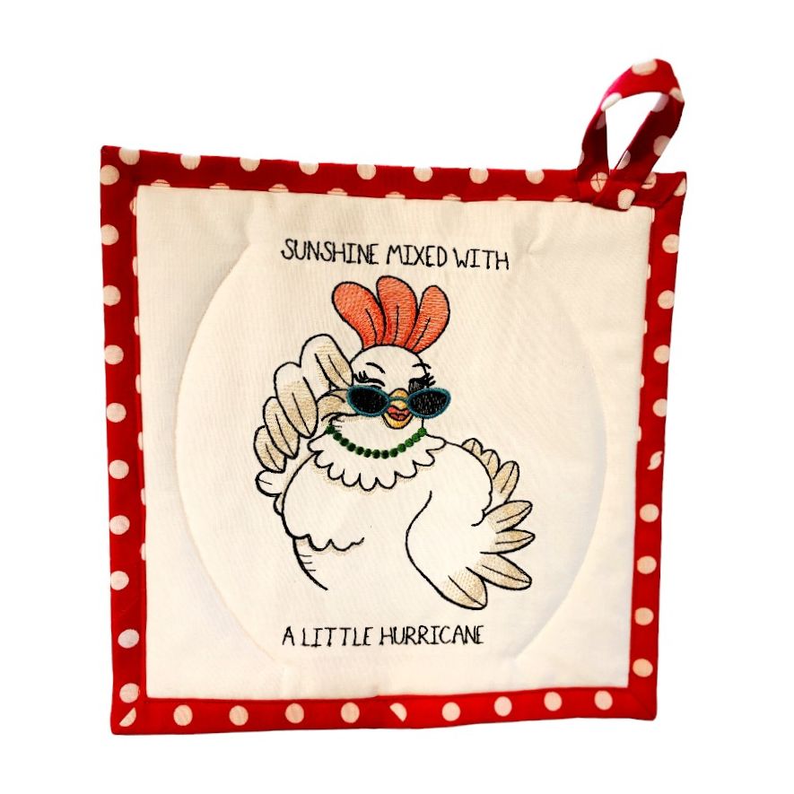 This handmade potholder has a chicken with sunglasses and a necklace with the saying, "Sunshine mixed with a little Hurricane" embroidered on it. So cute!