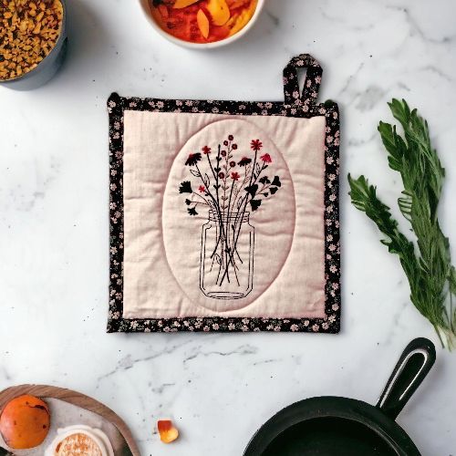 Embroidered Potholder Hot Pad with a Dainty Bloom Bouquet in a glass Jar design with brighten your kitchen anytime of year. Functional and beautiful. Harvest Array.