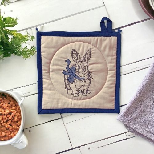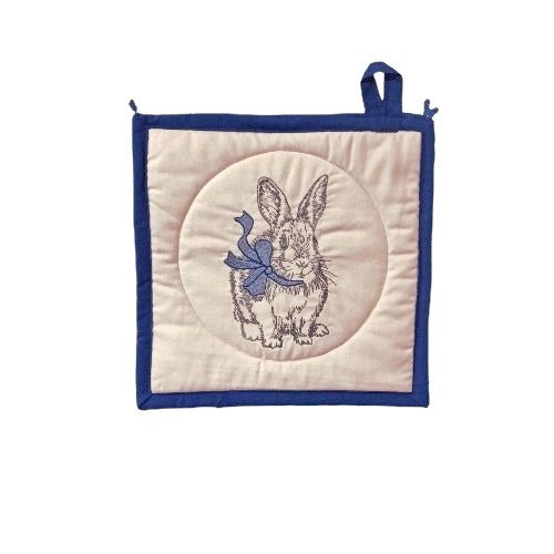 Rabbit wearing a blue ribbon, Embroidered Potholders/Hot Pad