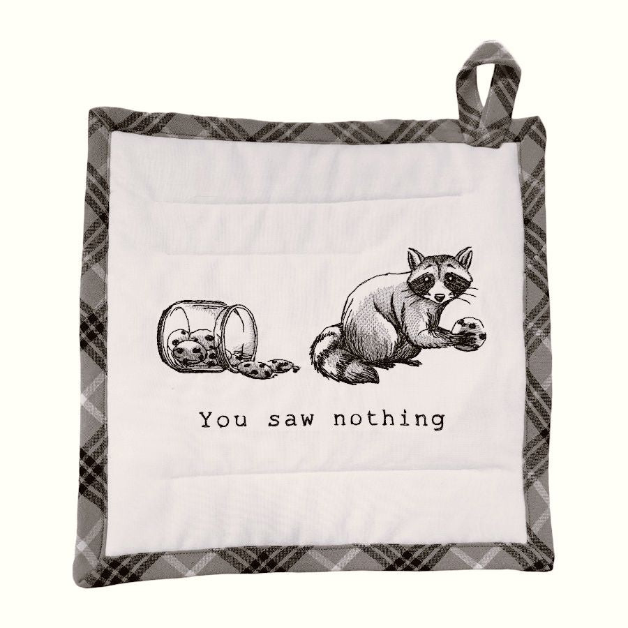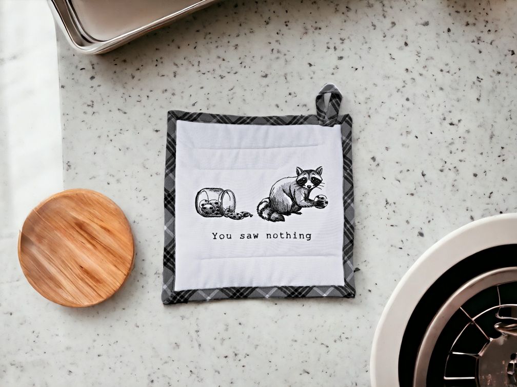 Shop Harvest Array for cute, embroidered potholders with humorous sayings like this one with "You saw nothing" and a picture of a raccoon stealing a cookie from the cookie jar!