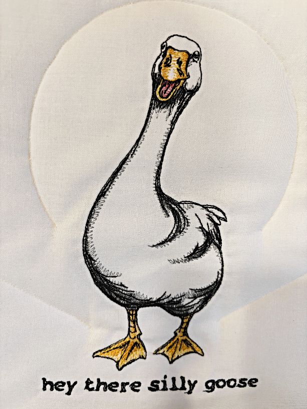 This cute Potholder has a Goose on it with the saying, "Hey there silly goose" embroidered on it.  The back is yellow with white polka dots.