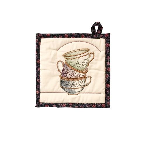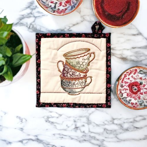 Elegant "Three Teacups," Embroidered Potholders/Hot Pads