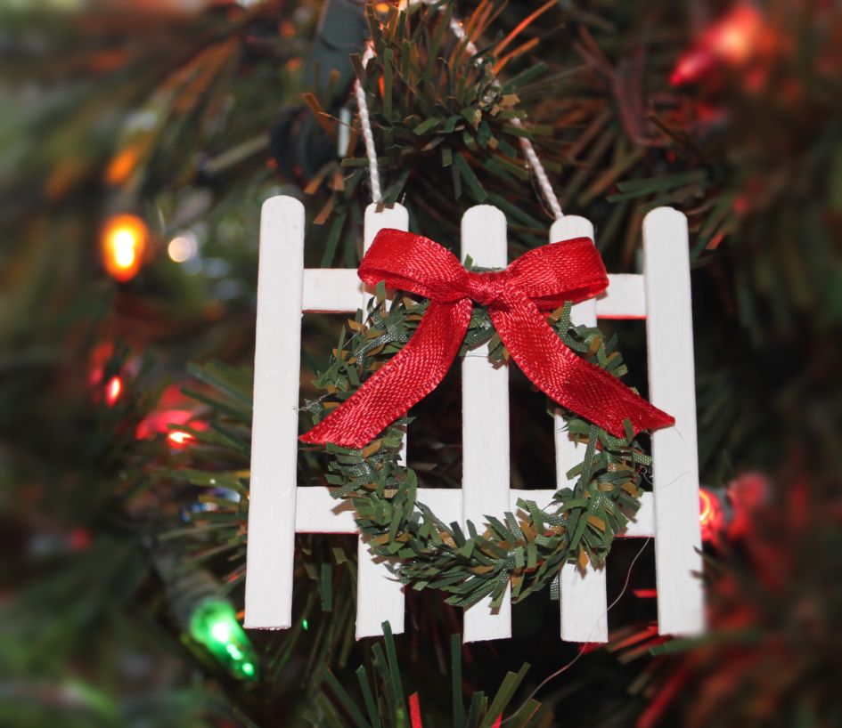 Handcrafted Mini Picket Fence with Bow Christmas Ornament on Tree.