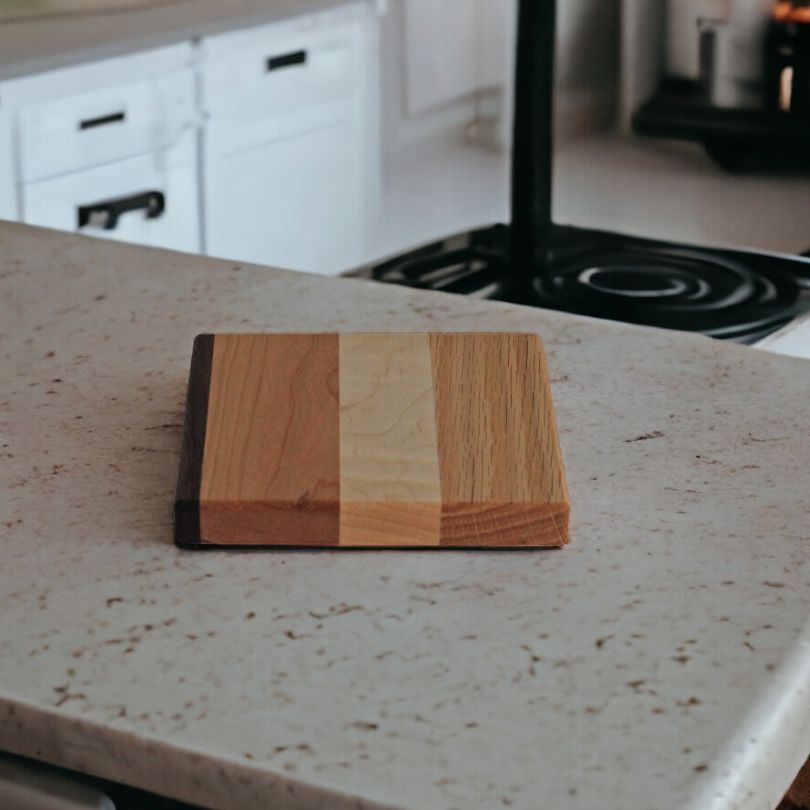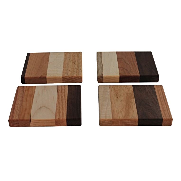 Each hot pad has 4 shades of wood stripes that vary from natural to a dark walnut color. The widths of the stripes also vary, making each one a unique design.