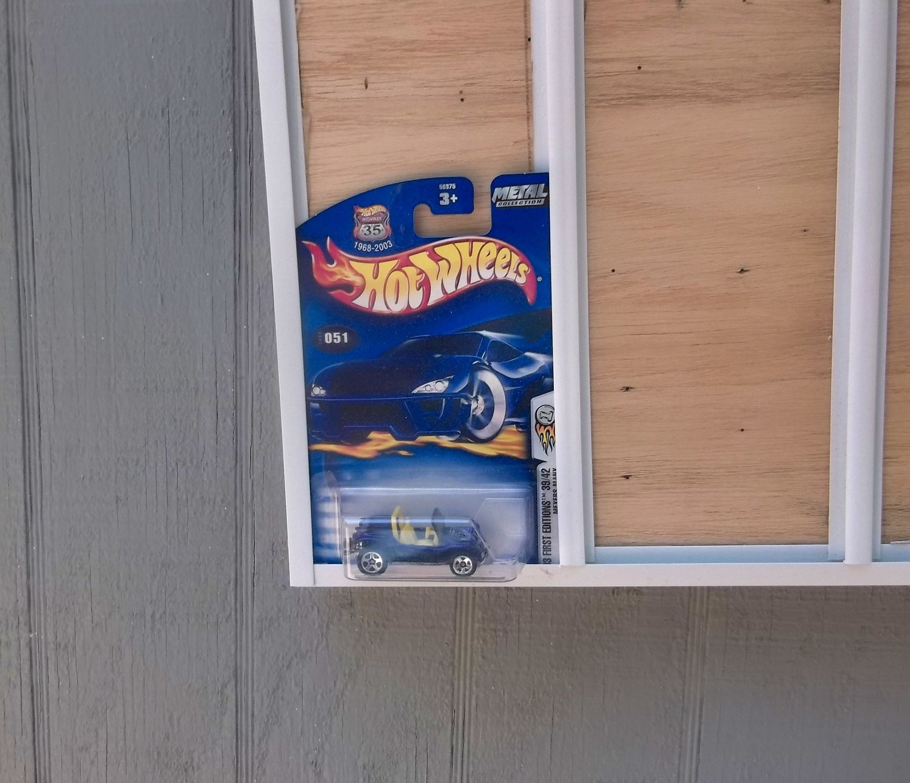 Each hot wheels rack is handmade of sturdy quarter inch wood panel framed on the back by 1-1.5 inch wide sturdy pine wood and has 1 center hanger with 25-pound capacity. The rails to hold the cars are made of durable plastic.