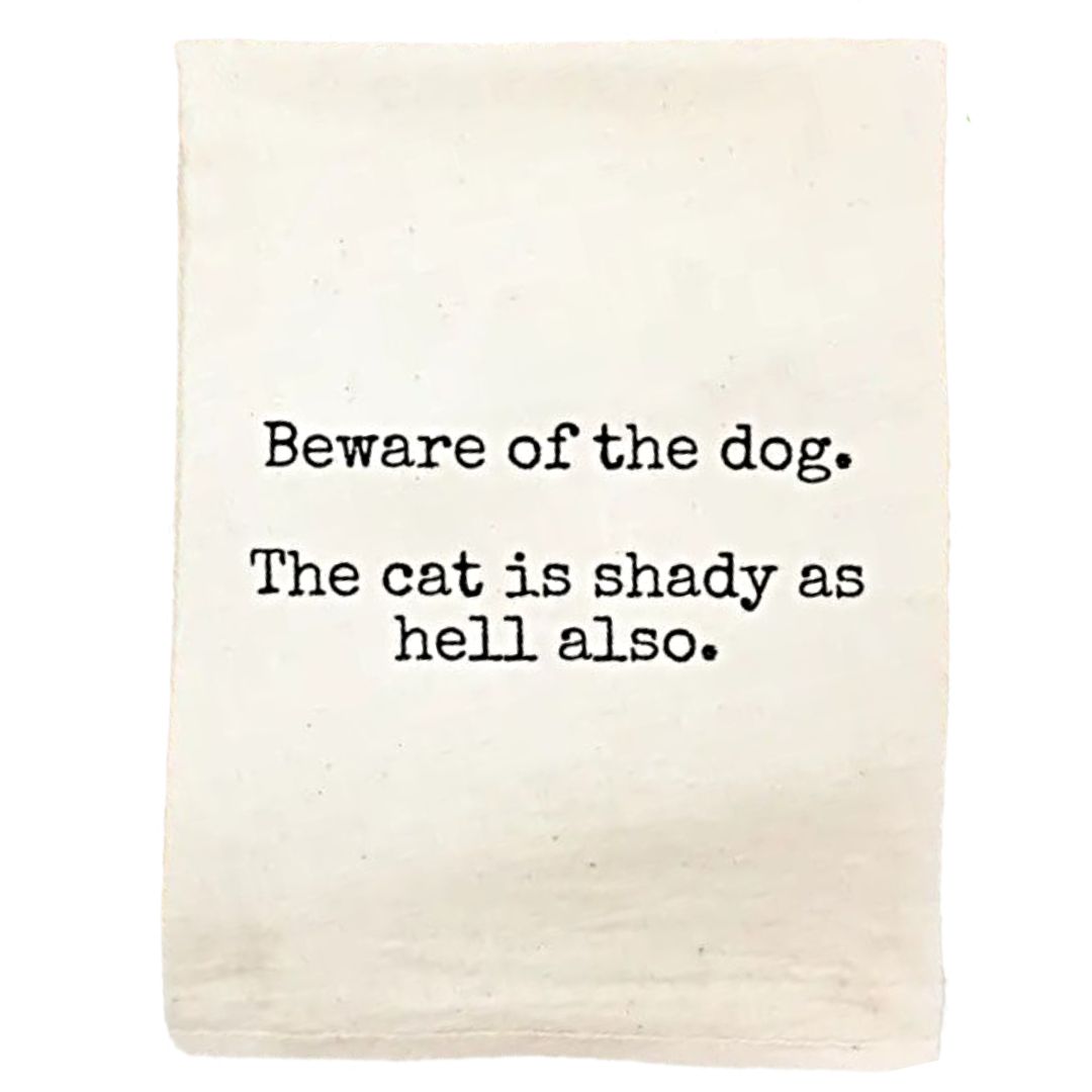 This towel makes dish duty more laughable with the words, "Beware of the dog. The cat is shady as hell also" printed on it. Order today at Harvest Array.