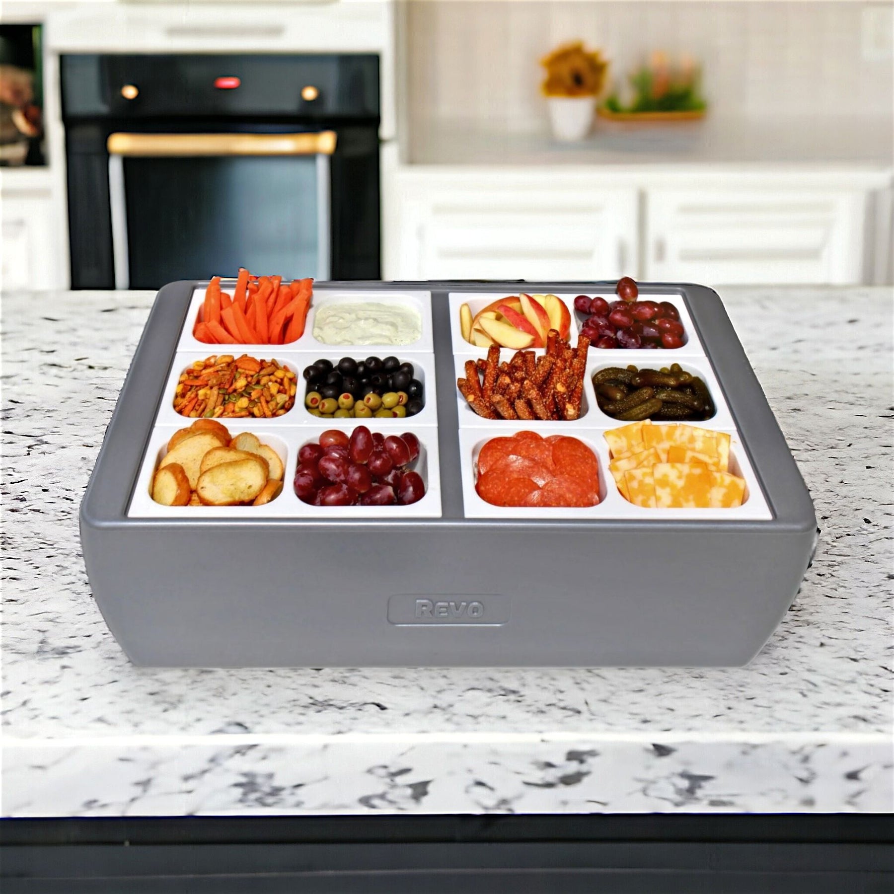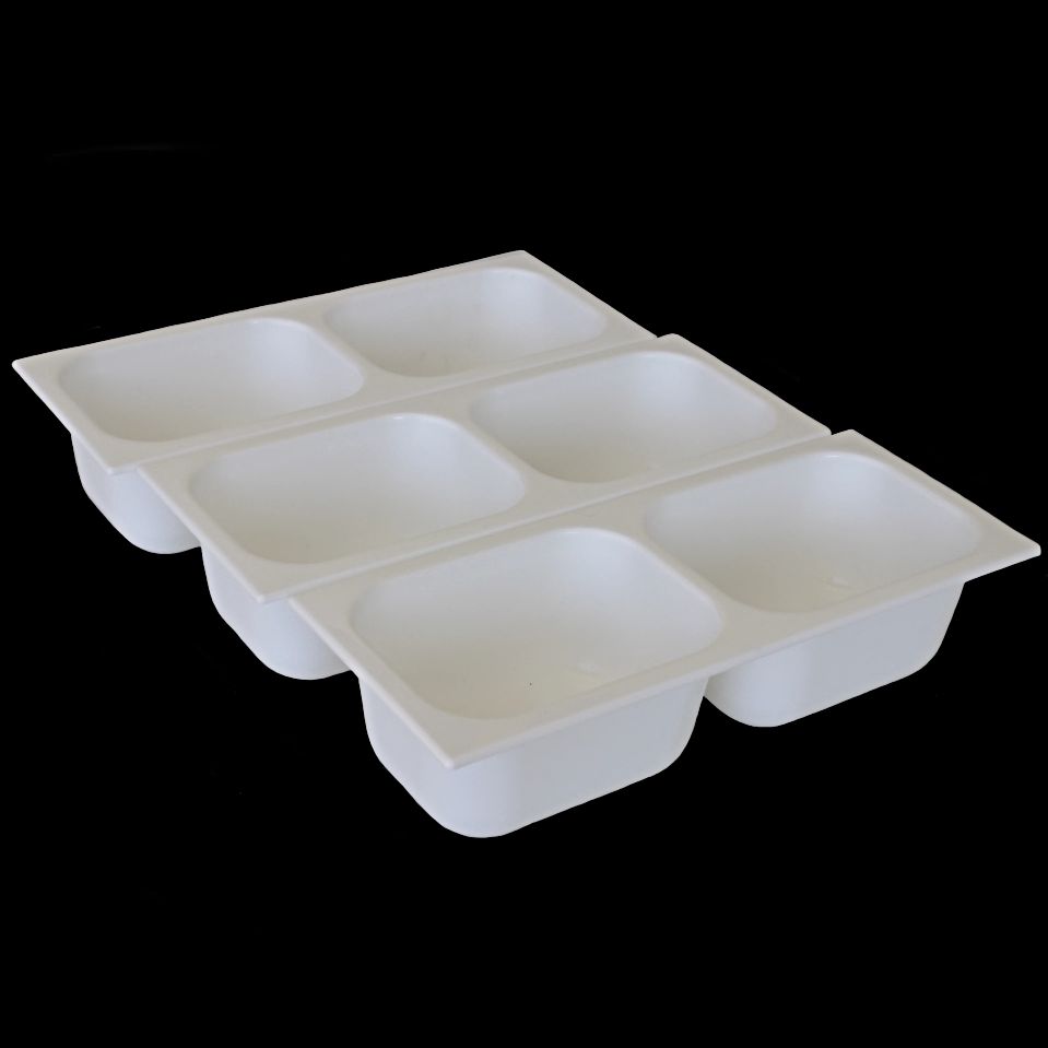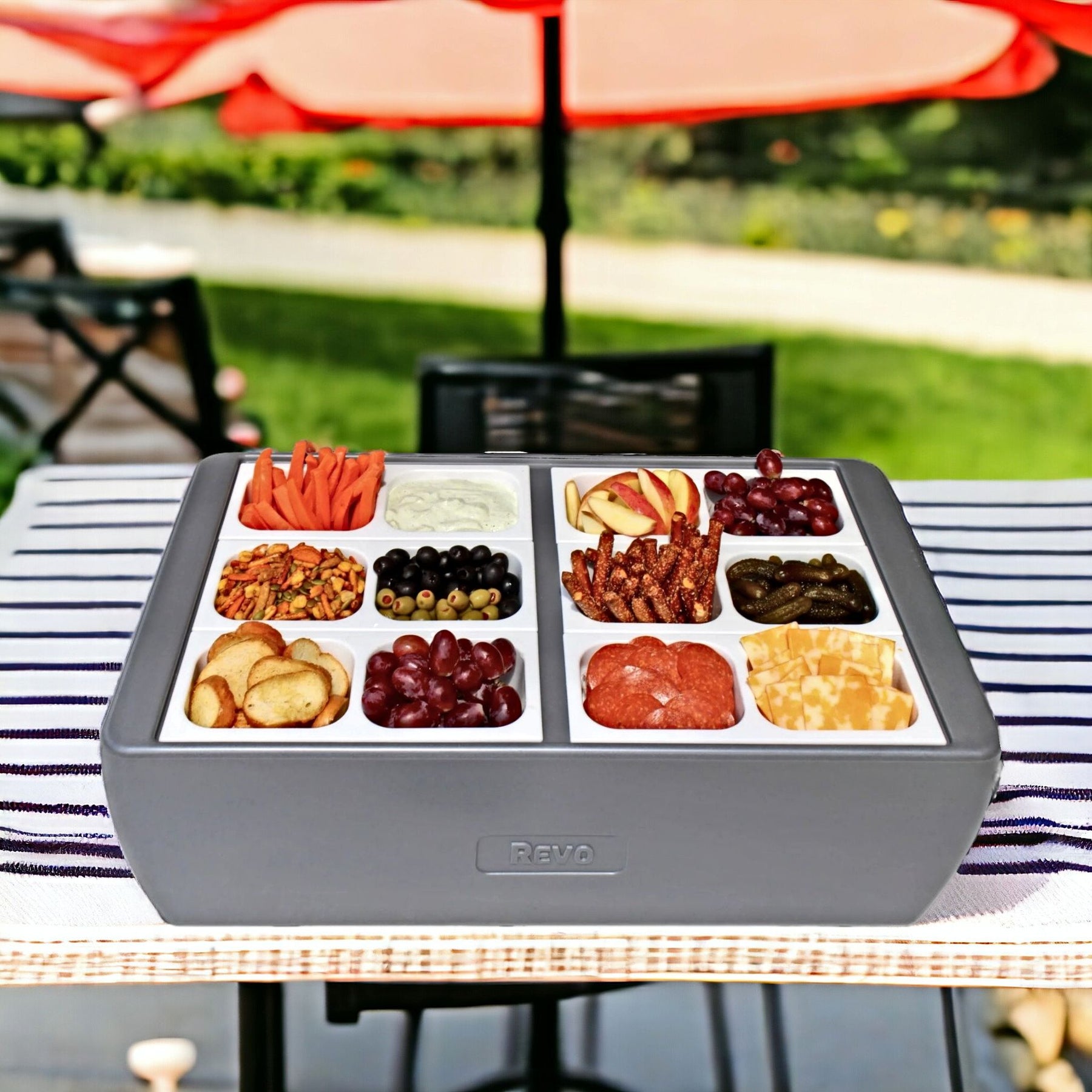 Turn your REVO Dubler Party Cooler into a salad bar, fruit bar, sundae bar, and more with an Extra Set of Three Condiment Trays purchased here at Harvest Array. The Dubler Cooler comes with three condiment trays but will fit six trays perfectly. Each tray is equipped with two compartments that are FDA approved for food contact and can be safely washed in the dishwasher.