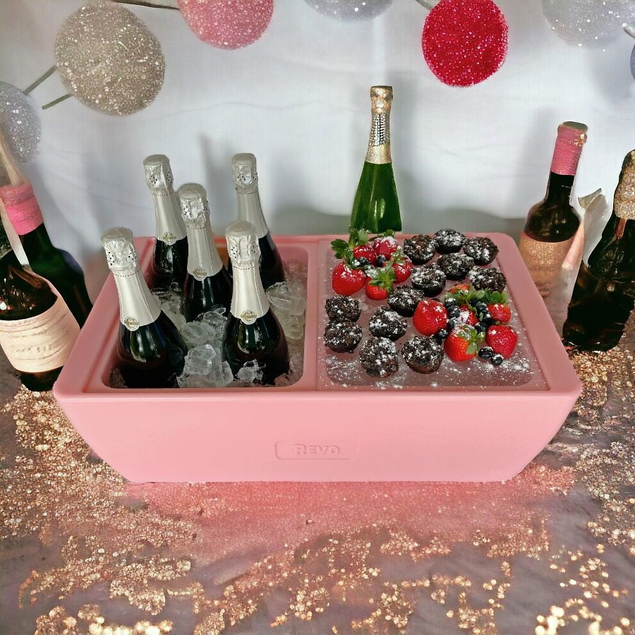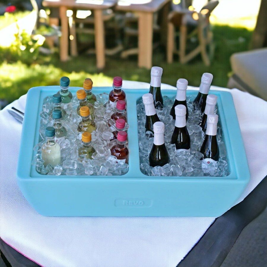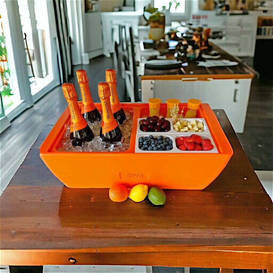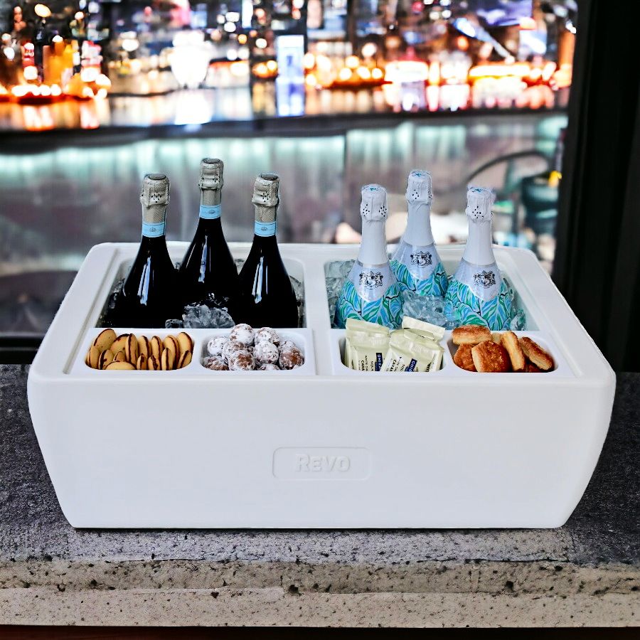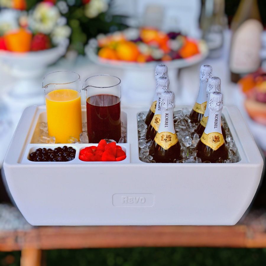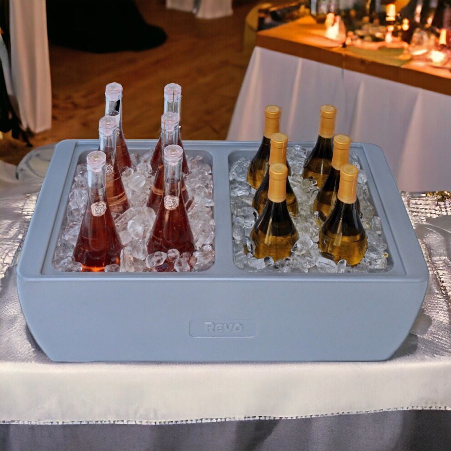 The two compartments in the REVO Dubler Cooler can act as a beverage station for a wedding shower, small, intimate wedding, retirement party, poker night, or bunko night. This cooler can serve as a Mimosa bar to a Taco Bar to a Salad Bar. It makes it easy for guests to serve themselves.