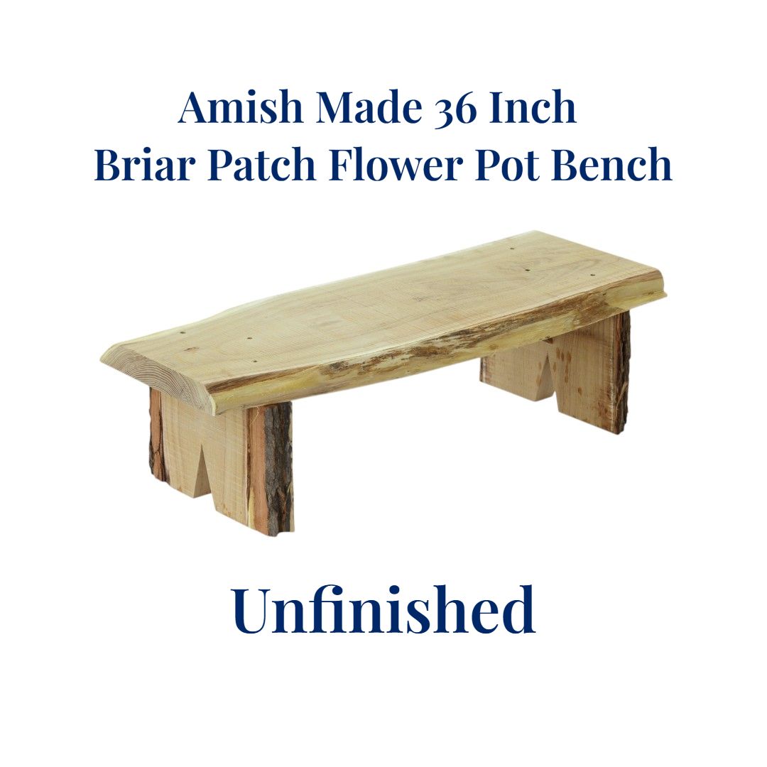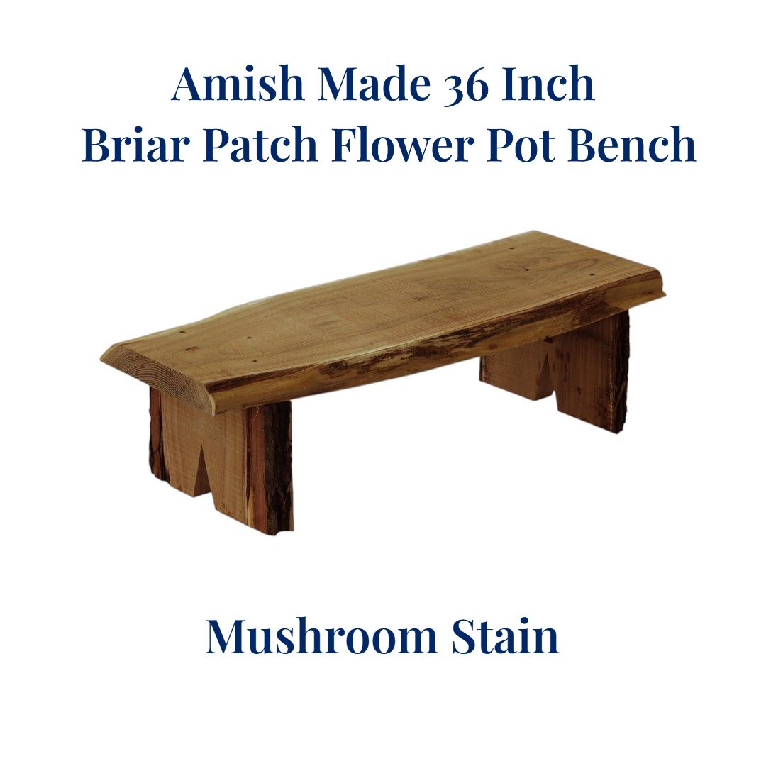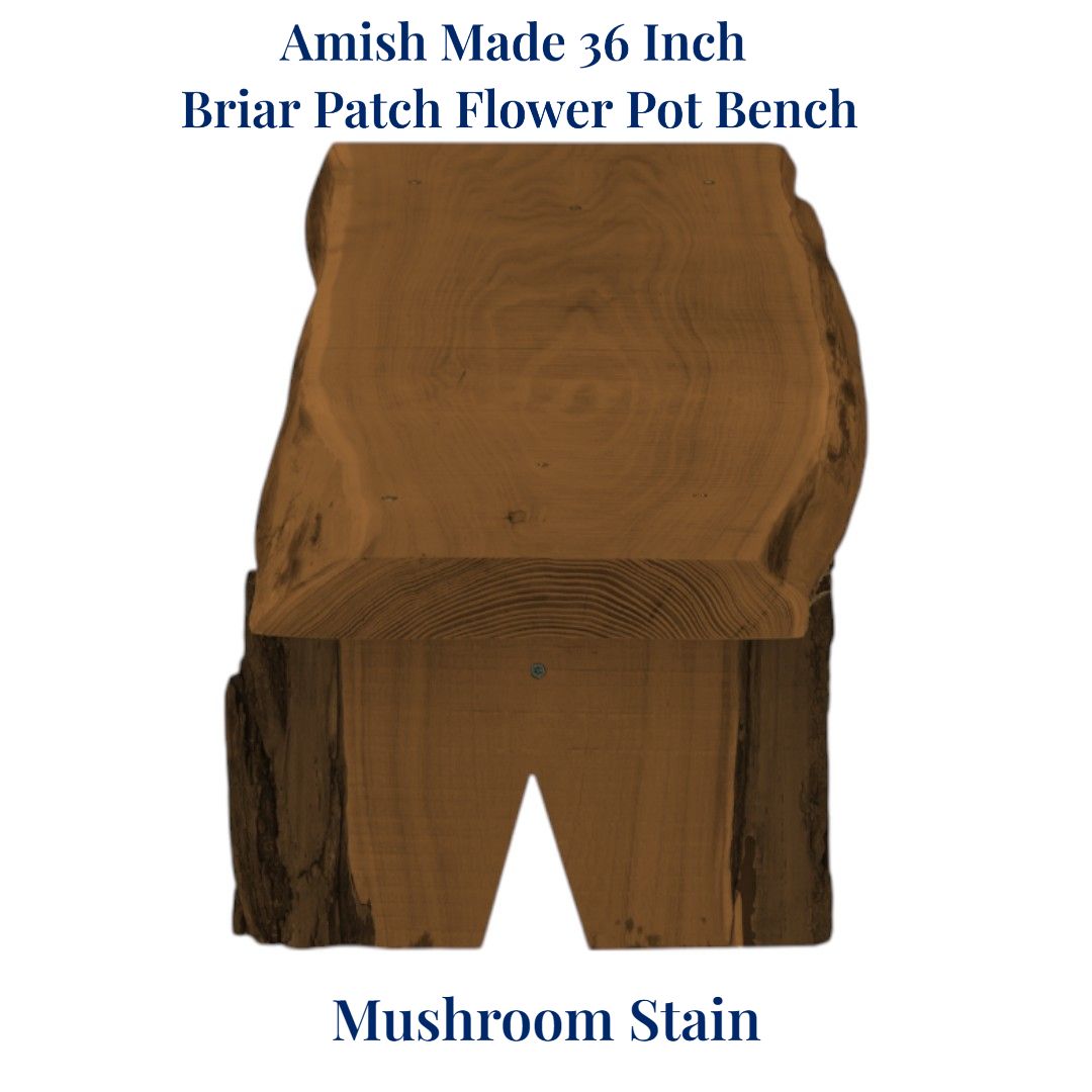 Choose between four finishes - unfinished, natural, cedar, or mushroom, and indoor clear stain or outdoor weather sealer. We offer free shipping within the USA (excluding Alaska and Hawaii) for your convenience. Experience the joy of decorating your yard or indoor space with our rustic 36" Briar Patch Flower Pot Bench with Live Edge.