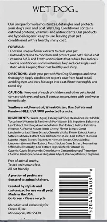 To Use: first wash with Wet Dog Canine Cutie Dog Shampoo, then rinse thoroughly. Next apply conditioner from head to tail, avoiding your pup's eyes and inner ears. Now, gently massage into the fur and rinse thoroughly. Lastly, towel dry and enjoy your fresh, clean, fur baby.