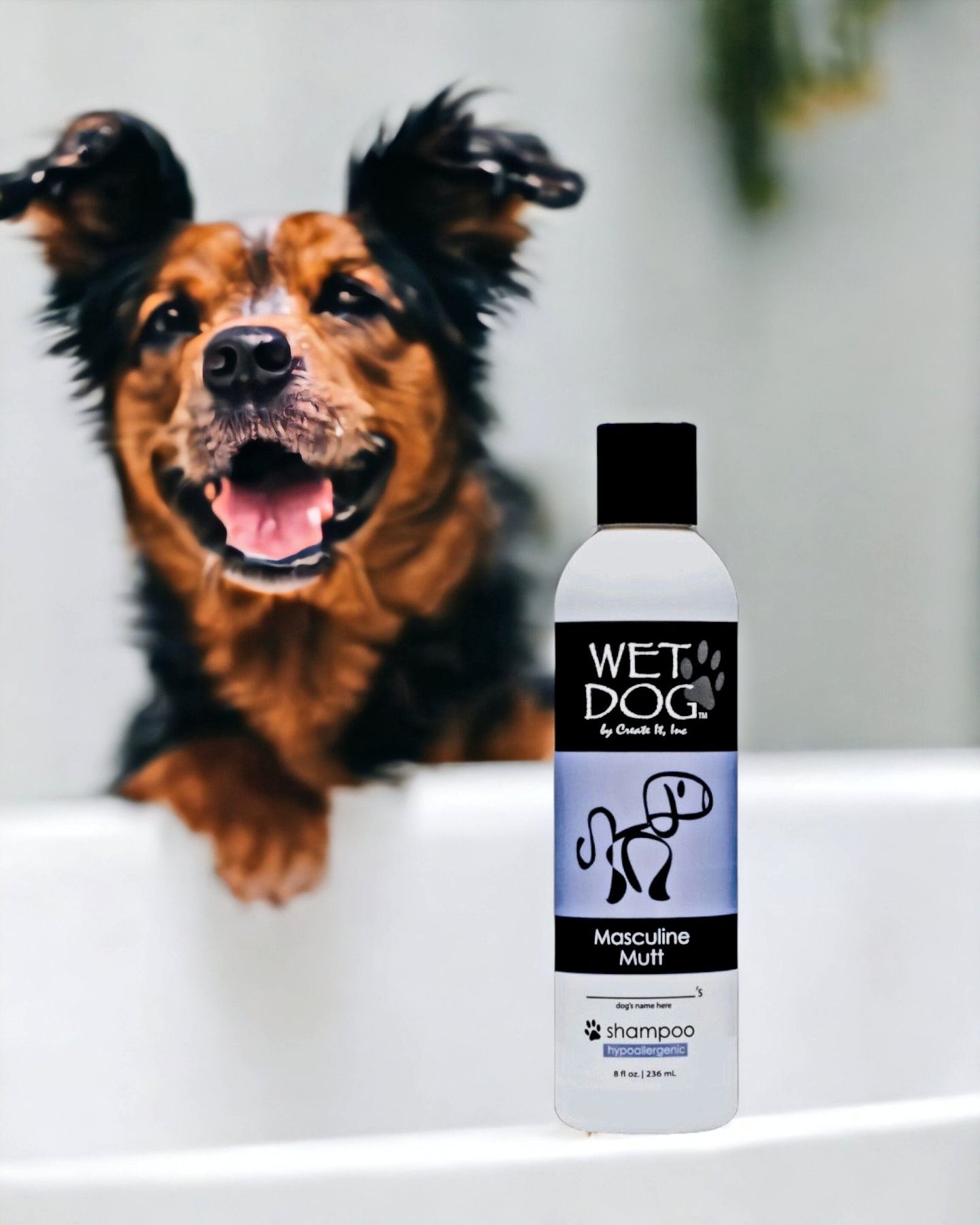To Use: First, brush out any loose dirt and debris from your dog's fur. Next, wet him down with water. Apply a small amount into the palm of your hand and rub your hands together to create a lather. Next massage it into his coat working from head to tail, avoiding your pup's eyes and inner ears. Rinse thoroughly with clean water and follow it with our Masculine Mutt Conditioner. Lastly, towel dry and enjoy your clean, soft, fresh-smelling best buddy.