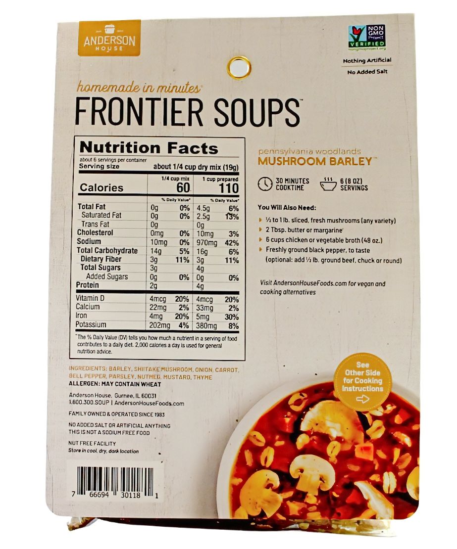 Back label of Anderson House Pennsylvania Woodlands Mushroom Barley Soup Mix. Available from Harvest Array.