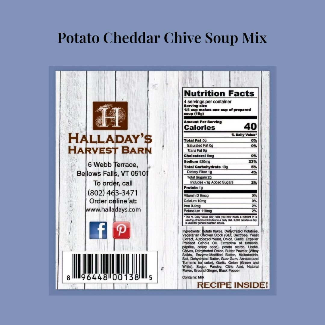 Nutrition and Ingredient Label for Potato Cheddar Chive Soup Mix from Halladay&